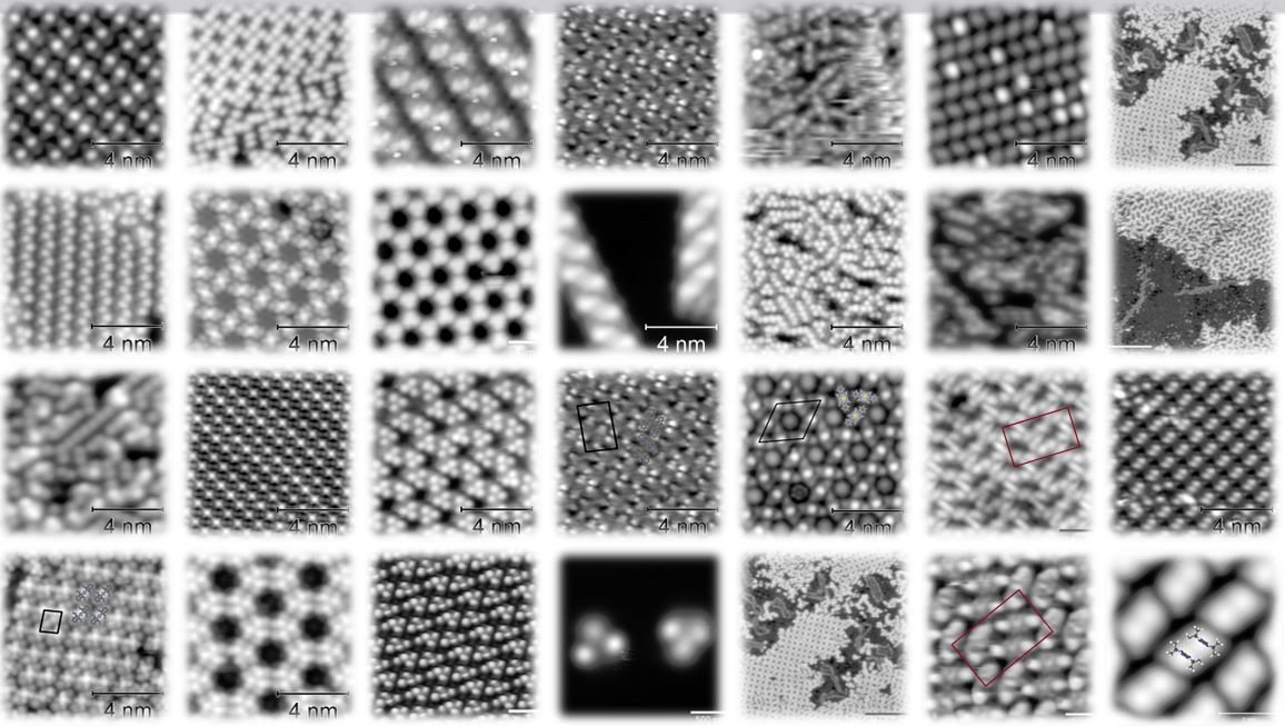 The rich number of N-heterocyclic carbene molecule self-assembly patterns observed on metal surfaces, as measured by scanning tunneling microscopy. Credit: Emmett Desroche